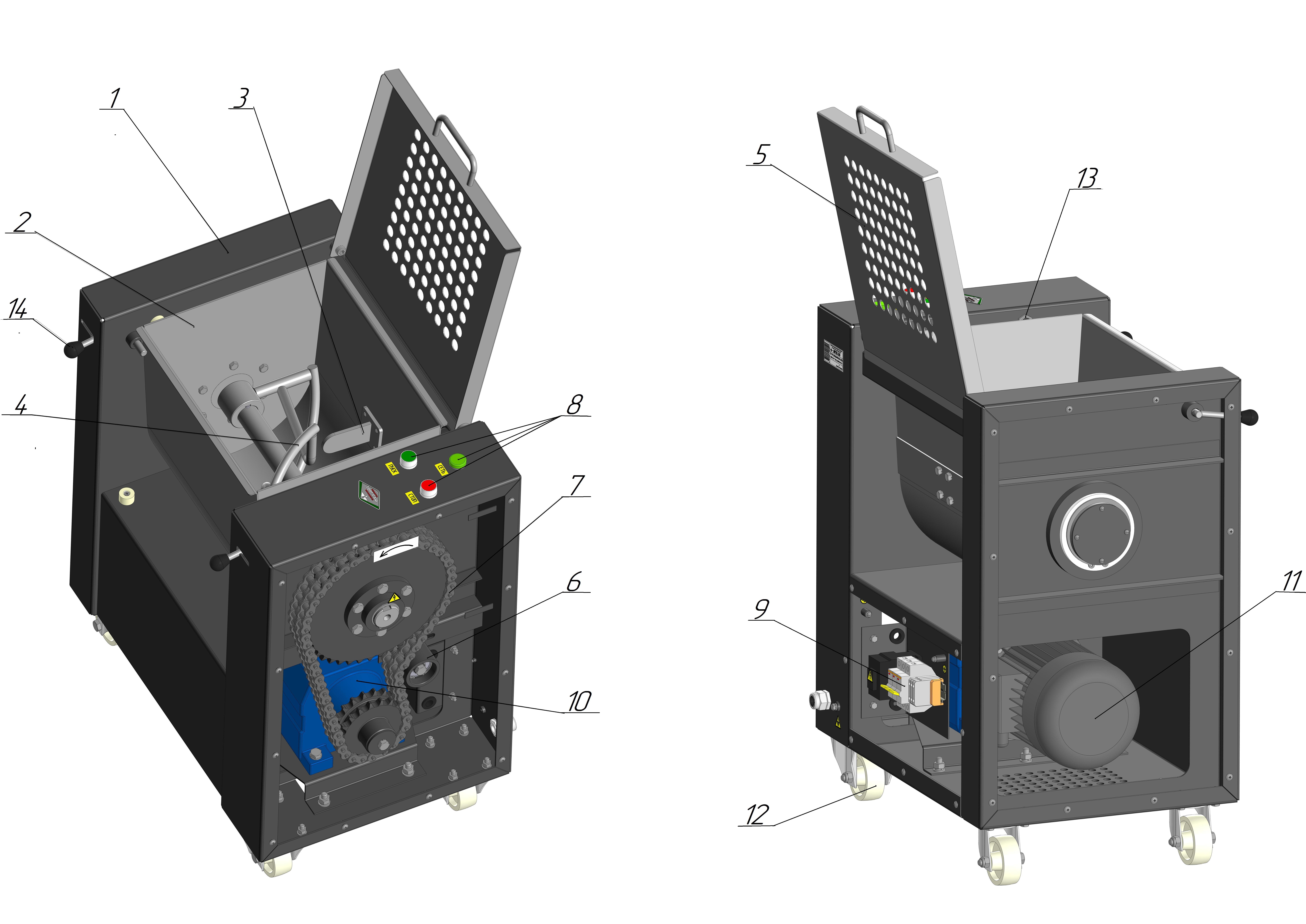 8-кнопки «СТОП», «ПУСК»; 9- электрооборудование; 10- пускатель; 11-двигатель; 12-опоры;
