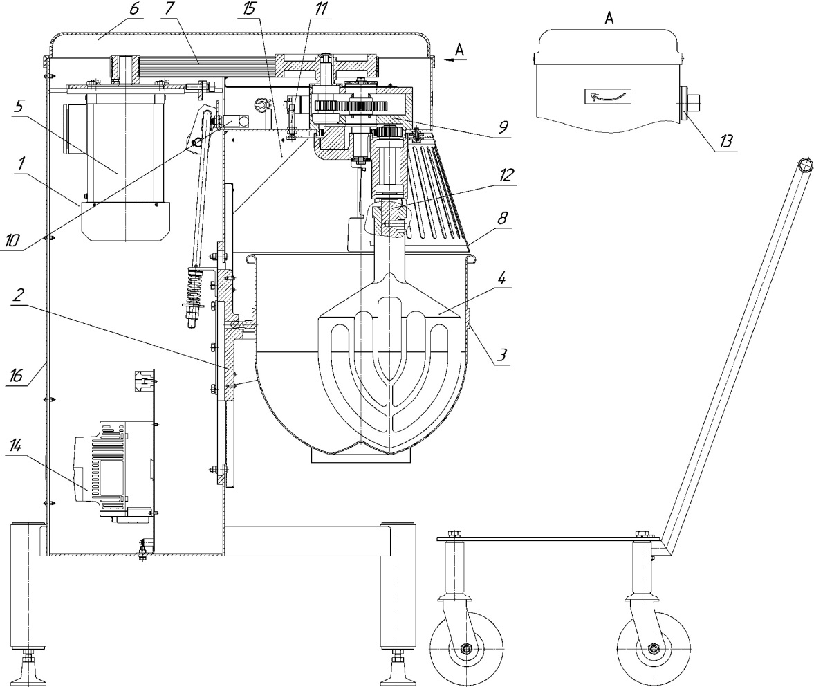 1 – корпус; 2 – кронштейн; 3 – дежа; 4 – сменный инструмент (лопатка, венчик, спираль); 5 –двигатель; 6 – колпак; 7 – ременная передача; 8 – щиток; 9 – редуктор; 10 – микровыключатель; 11- магнитный выключатель; 12 – выходной вал; 13 – кнопки («ПУСК»-«СТОП» с подсветкой; резистор переменный); 14 – панель частотного преобразователя; 15 – щиток; 16 – крышка задняя; 17- опоры ; 18-тележка (для миксеров МП-40)