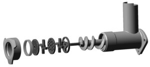 Перерабатываемый продукт из чаши вручную подается к горловине корпуса мясорубки, а затем толкачем к вращающемуся шнеку. Увлекаемый шнеком продукт проходит последовательно через набор режущих инструментов.