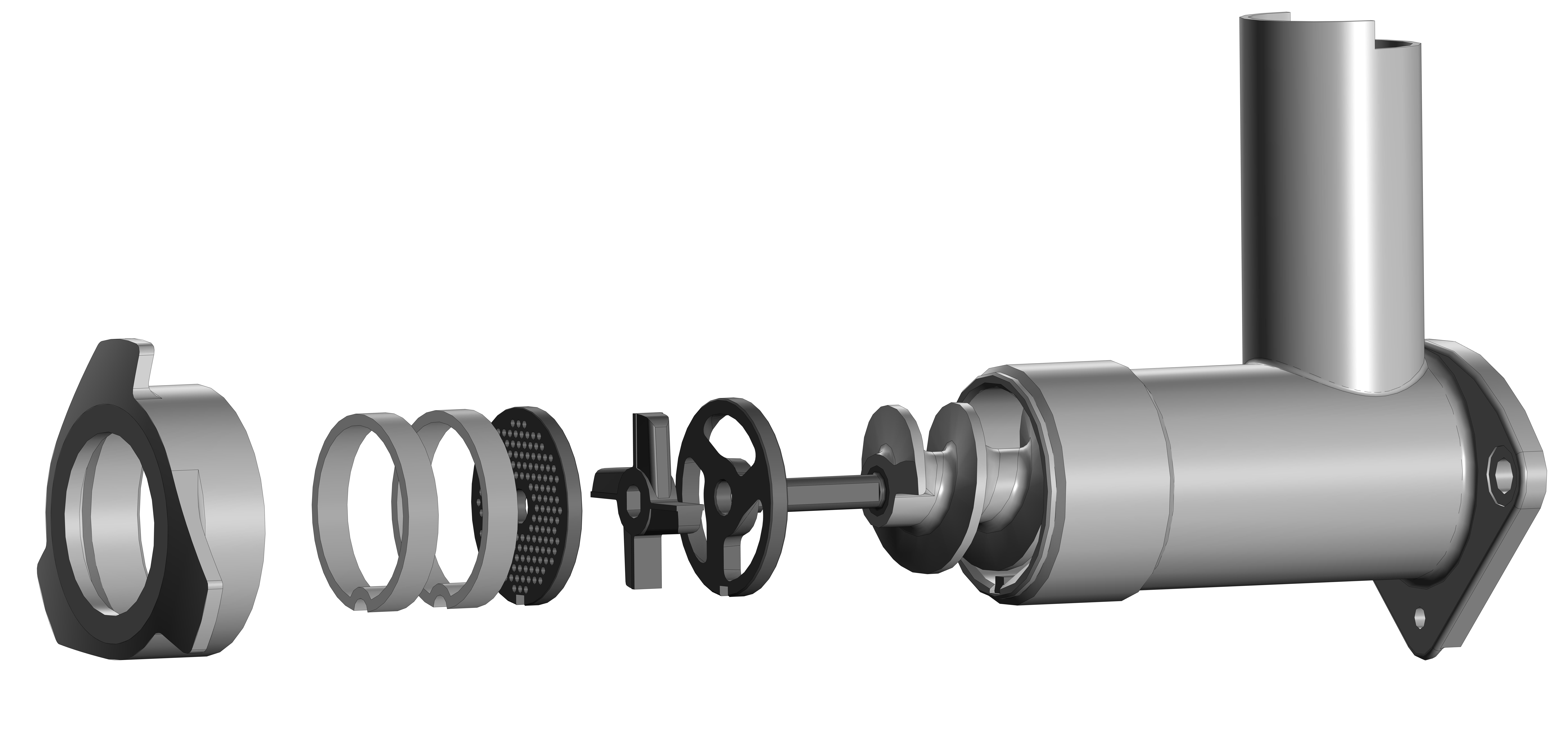 Для получения фарша разной степени измельчения мясорубка снабжена набором ножевых решеток с отверстиями различных размеров. Решетки вставляются в корпус мясорубки и удерживаются от проворачивания шпонкой.